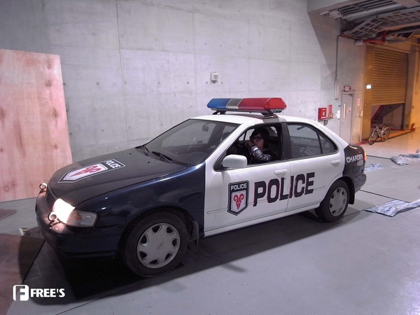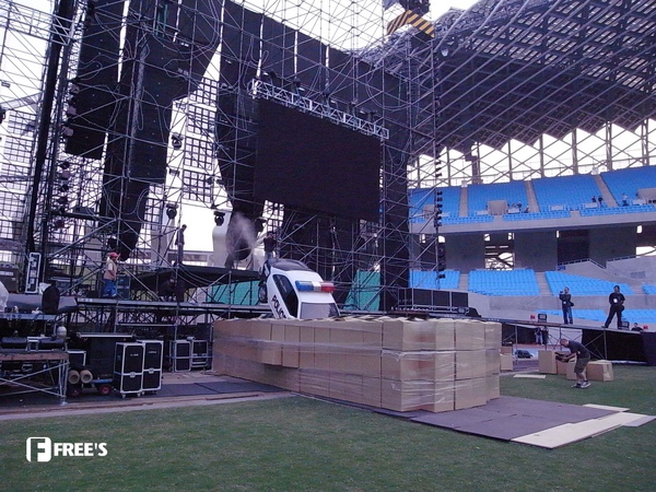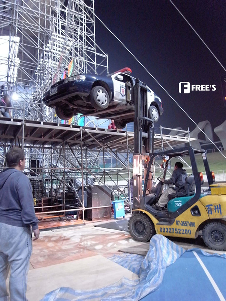 非常難想像這台警車在演出時要從5M高的地方,從兩側Layher中衝入人群,