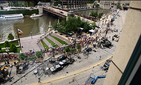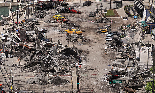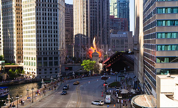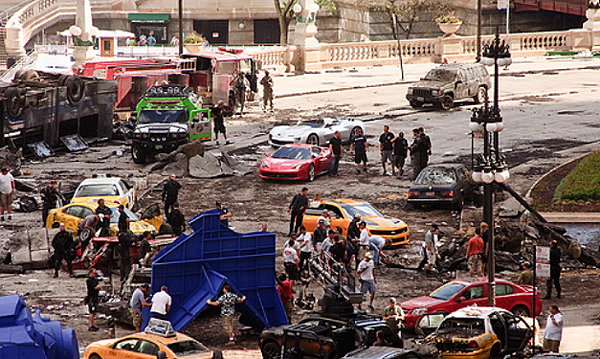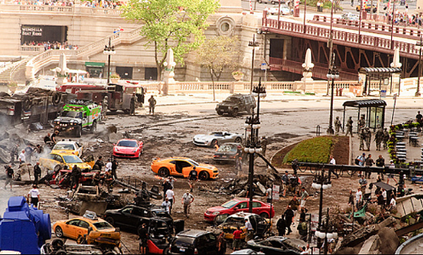 該部分在芝加哥封街取景,只見兩派變形金剛在摩天大樓間穿梭橫掃,